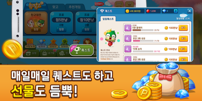 피망뉴맞고 바로가기를 하다보면 매 판마다 미션이 있는 것을 확인할 수 있는데요. 매번 다양하게 미션이 주어지기 때문에 이것을 달성하고 이기면 점수의 몇 배를 얻을 수 있습니다. 그러므로 이 부분도 잘 생각하고 해야 합니다.
